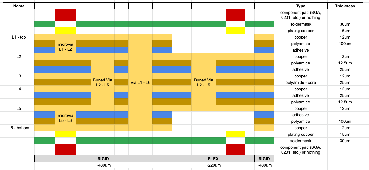 That leaves us with a rigid-flex board, where parts of the PCB are flex and others are rigid. The flex PCB stackup serves as the base, and the rigid part is done by just sandwiching some more PCB layers on top of the flex. Flex PCBs can be made very thin, which is a great advantage, and they generally support full vias only. In the rigid part, these vias basically serve us as “free” buried vias. After adding the rigid part, we can also have full thru vias, and we can also get laser microvias (only from the outermost layer to the first next copper layer).